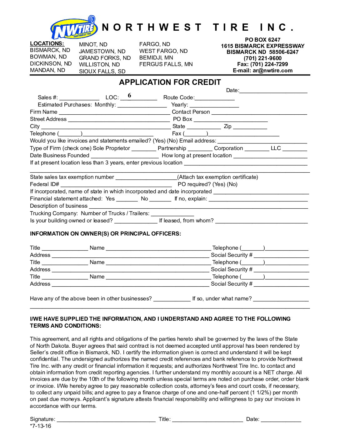 Fill out the form and send it in to the address shown in the top right corner of the form. A representative from Northwest Tire will then contact you.